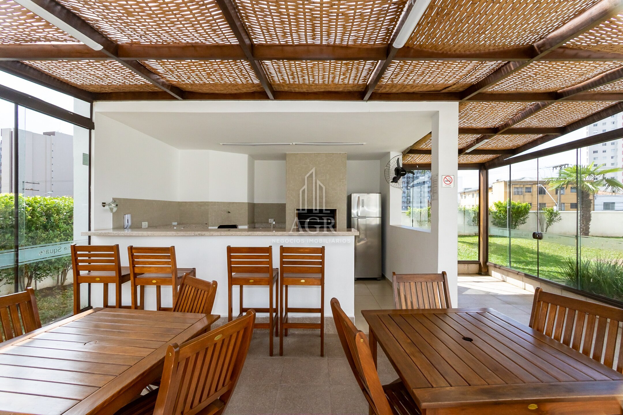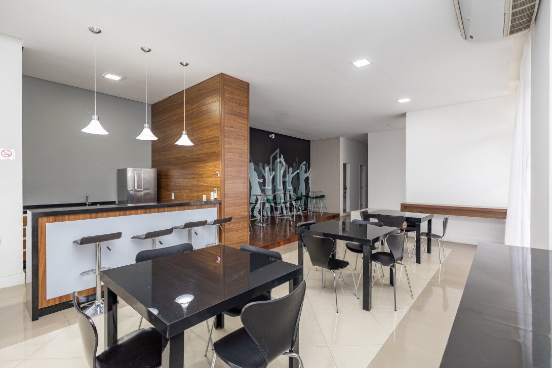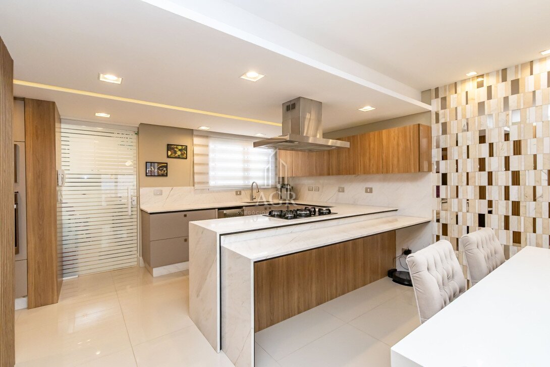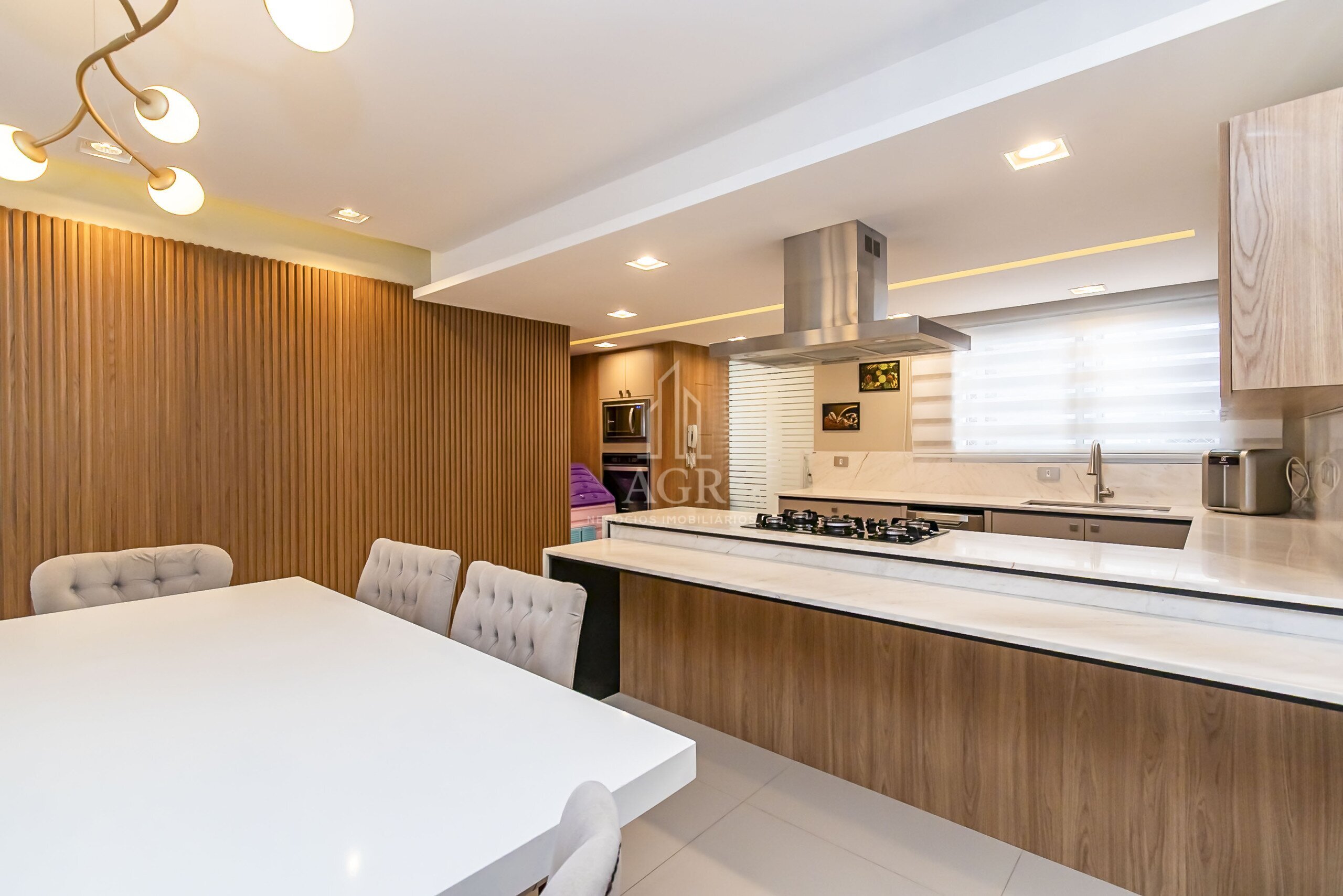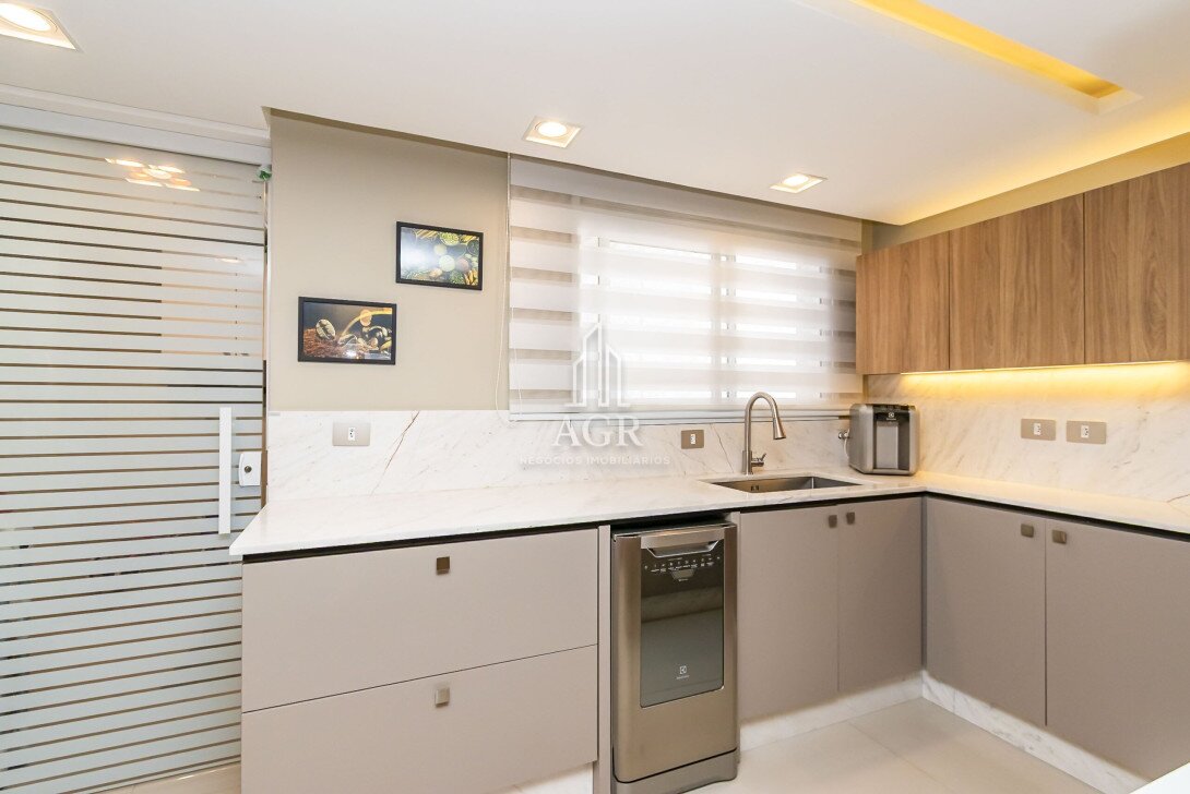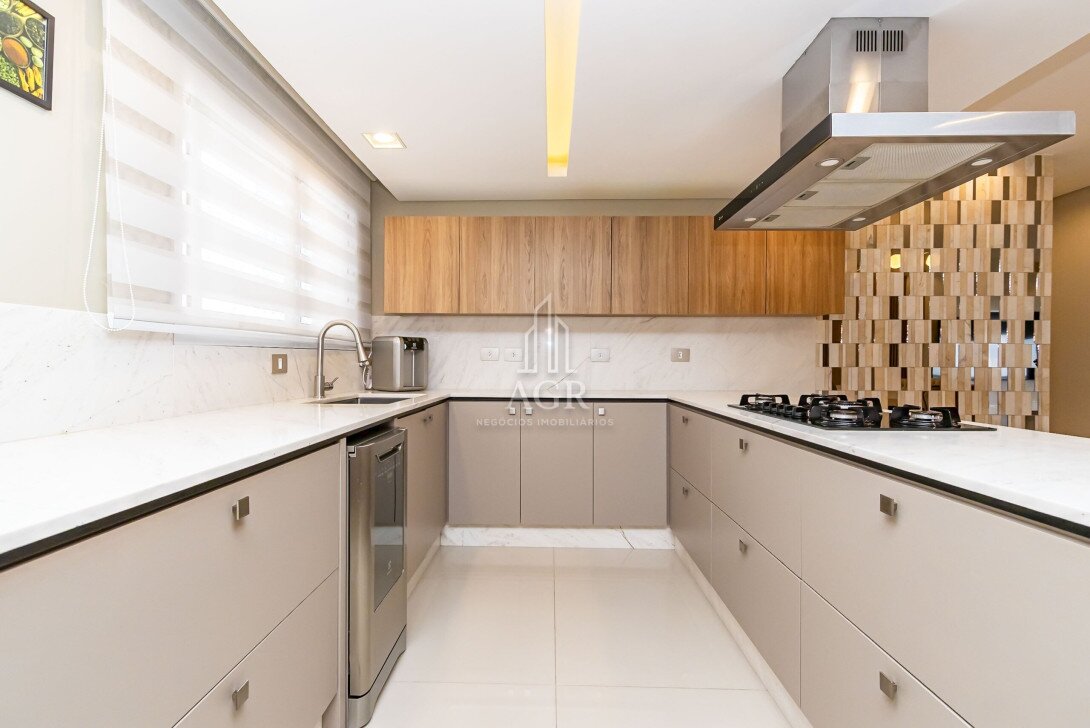 A cozinha, moderna e funcional, possui ilha central e torre de eletros embutidos, criando um visual elegante e prático.