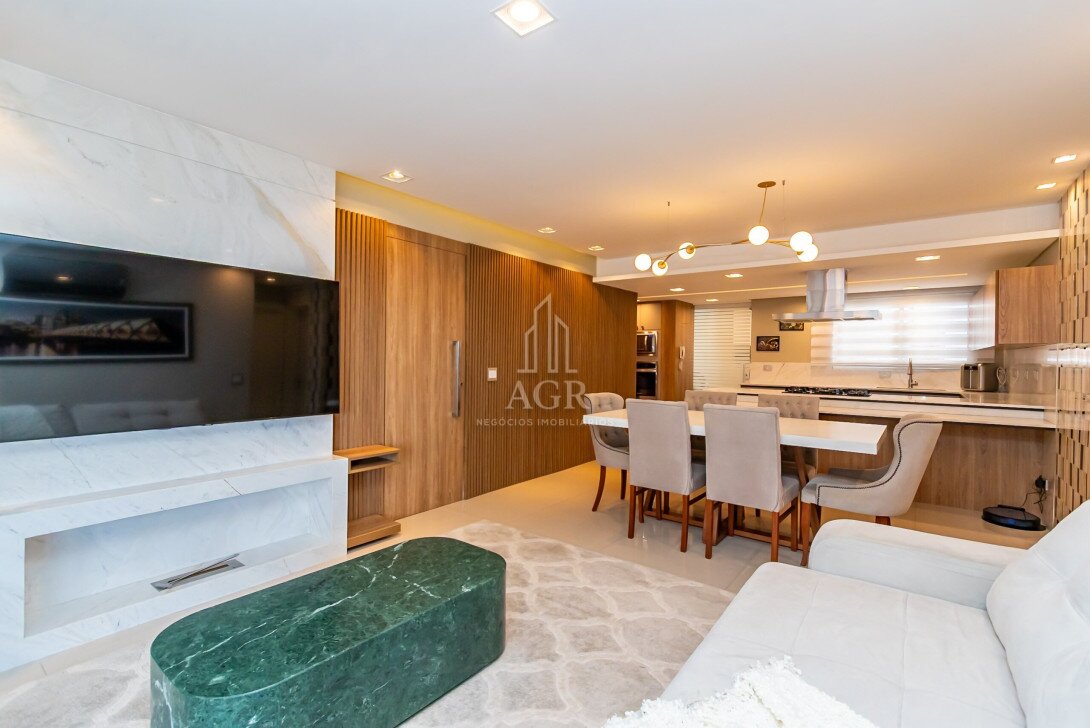 A sala de estar é ampla e integrada à cozinha — um espaço perfeito para receber. Conta com móveis planejados, lareira, ar-condicionado e iluminação acolhedora.