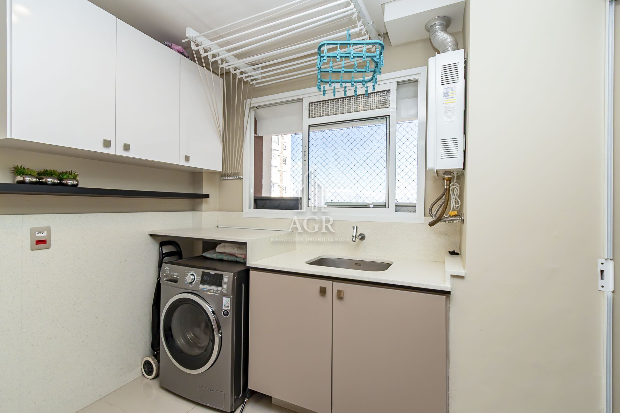 A lavanderia é ampla, com acesso independente e banheiro de serviço.