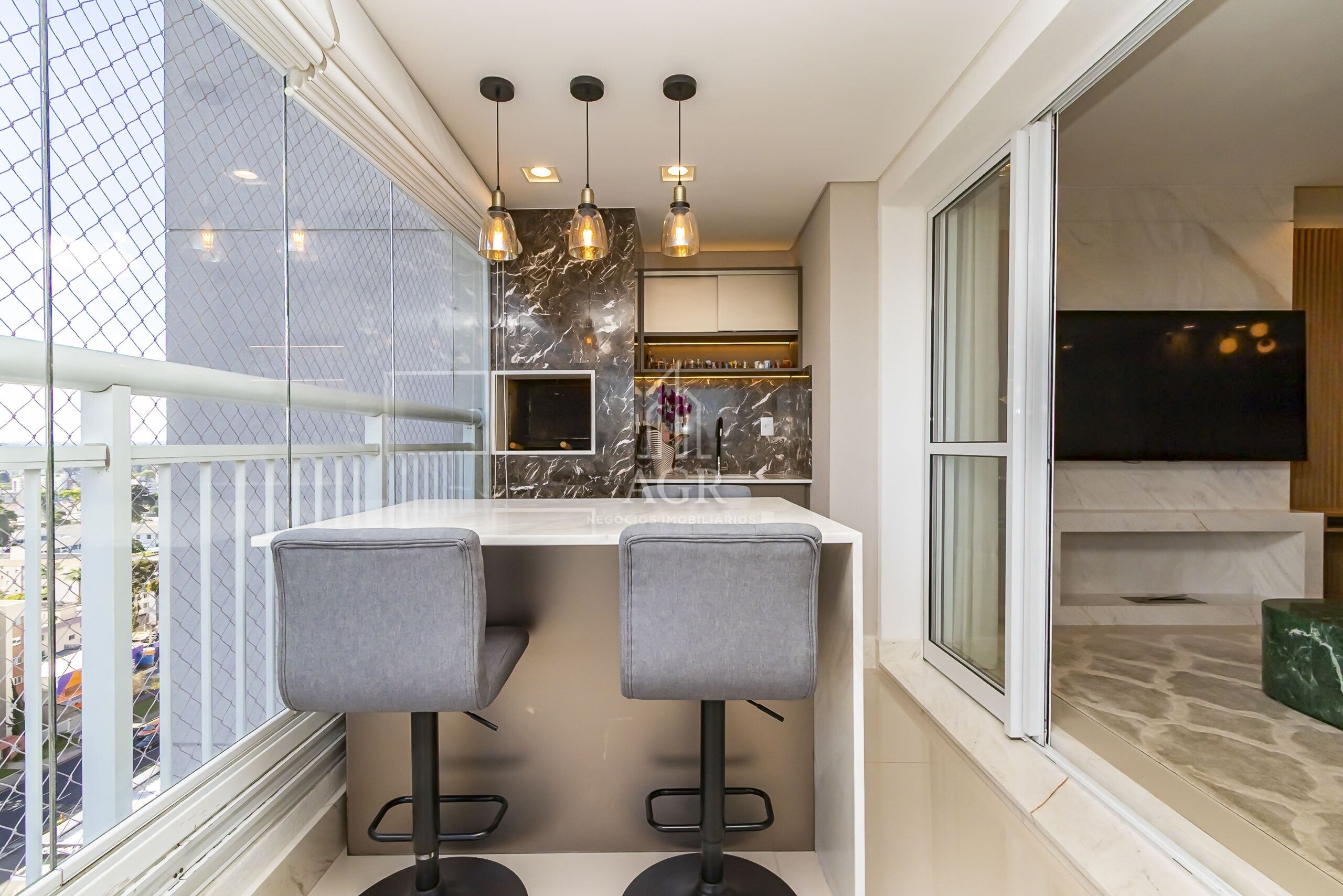 A sacada é um convite para relaxar: espaçosa, ensolarada, com churrasqueira a carvão, fechamento em vidro e móveis sob medida.